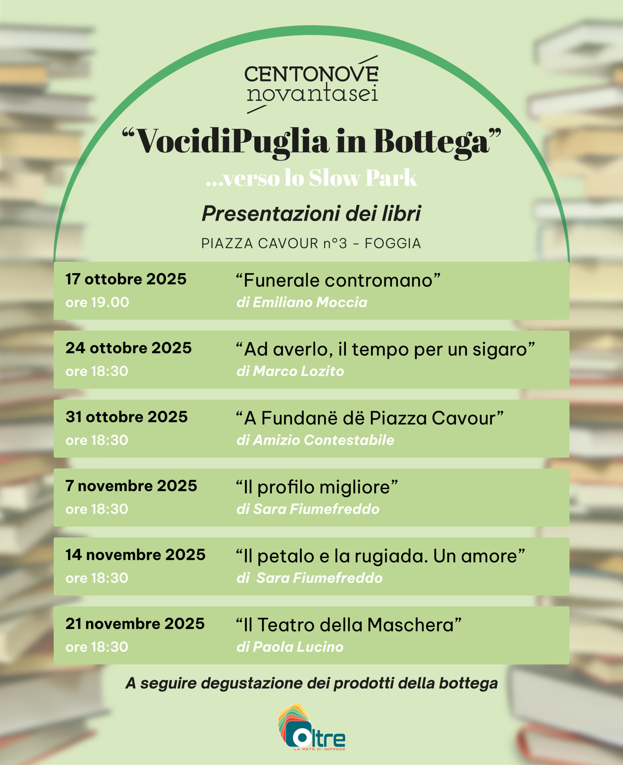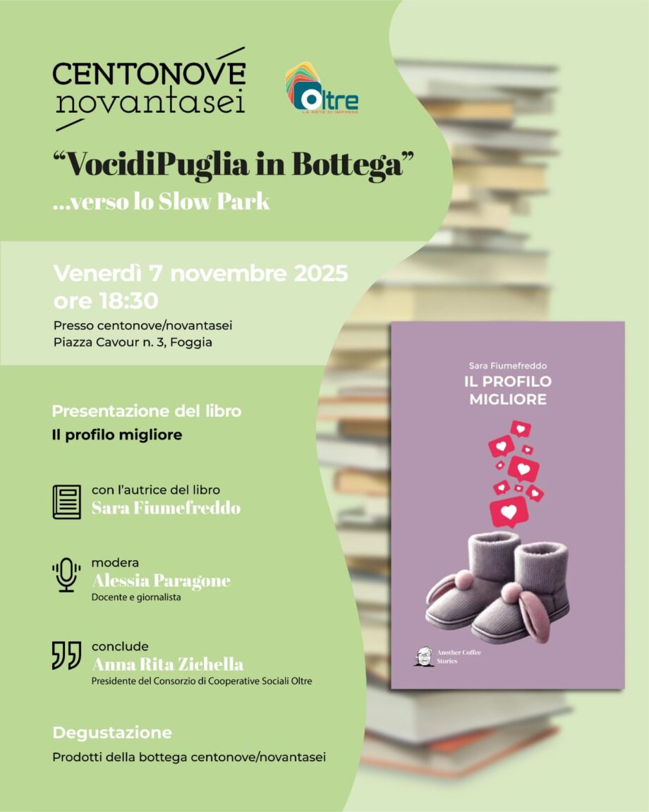 Una rassegna di libri con voci di autrici e autori pugliesi per accompagnare la comunita di Foggia verso l’apertura dello Slow Park, la cui gestione e stata affidata dal Comune di Foggia dopo bando pubblico al consorzio di cooperative sociali Oltre la rete di imprese, che opera nel territorio della provincia di Foggia e non solo in un’ottica di responsabilita etica e solidale, aprendo attraverso le cooperative che ne fanno parte il suo raggio di azione in settori quali accoglienza, inclusione, sviluppo locale, agricoltura sociale, antimafia, diritti, cultura, lavoro. La rassegna “VocidiPuglia – Verso lo Slow Park” segue le orme dei “Venerdi in Bottega” organizzati in questi anni negli spazi di “centonove/novantasei”, la bottega che a Foggia in piazza Cavour n. 3 vende prodotti etici, solidali e liberati dalle mafie.