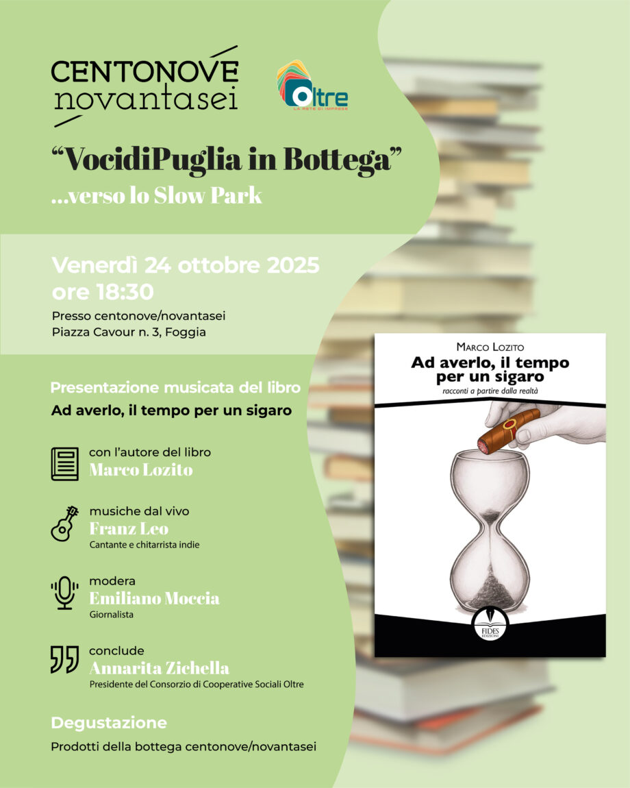 Un tennista capisce che perdere sorridendo è una mezza vittoria, un uomo grida “Aiuto!” ma tutti lo applaudono. I computer ci parlano e ci chiedono se siamo umani, ma noi siamo indaffarati come loro. Un uomo telefona a sé stesso, mentre una signora dalla Toscana chiama per uscire dalla solitudine del cellulare. Piccoli frammenti di vita quotidiana che con stile ironico ed originale ricordano che essere sé stessi, anche se imperfetti, ritardatari o sbadati, è l’unico modo per sentirsi veramente adeguati. Lo scrittore Marco Lozito torna a Foggia per presentare il suo nuovo libro “Ad averlo, il tempo per un sigaro” (Fides edizioni). E lo fa, venerdì 24 ottobre 2025, alle ore 18.30, nell’ambito della rassegna “VocidiPuglia – Verso lo Slow Park” organizzata negli spazi di “centonove/novantasei”, la bottega che a Foggia in piazza Cavour n. 3 vende prodotti etici, solidali e liberati dalle mafie.