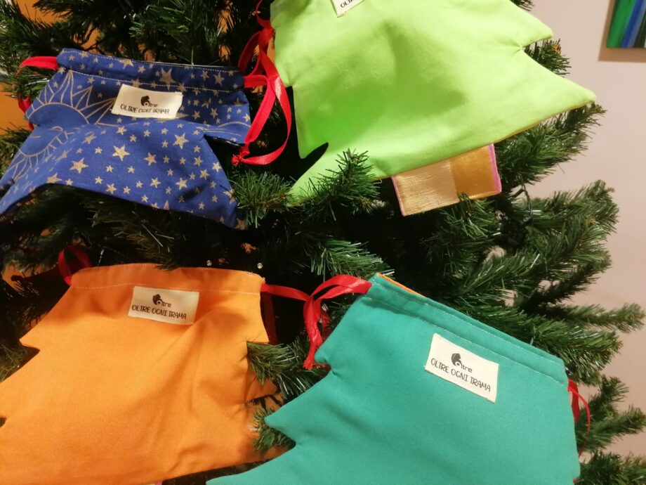 Alberelli di Natale in formato shopper in cui poter mettere gli acquisti natalizi fatti nella bottega Centonove/novantasei, in particolare barattoli di miele, confetture, prodotti sott’olio, buste di taralli ed altro ancora. Sono tutti penici unici, colorati, ricchi di storie, realizzati a mano nell’ambito dei laboratori di sartoria sociale “𝐎𝐥𝐭𝐫𝐞 𝐨𝐠𝐧𝐢 𝐭𝐫𝐚𝐦𝐚” curati da Medtraining attraverso il talento di beneficiarie e beneficiarie inseriti nei progetti 𝐒𝐀𝐈 – 𝐒𝐢𝐬𝐭𝐞𝐦𝐚 𝐝𝐢 𝐀𝐜𝐜𝐨𝐠𝐥𝐢𝐞𝐧𝐳𝐚 𝐞𝐝 𝐈𝐧𝐭𝐞𝐠𝐫𝐚𝐳𝐢𝐨𝐧𝐞 e nella La Puglia Non Tratta.