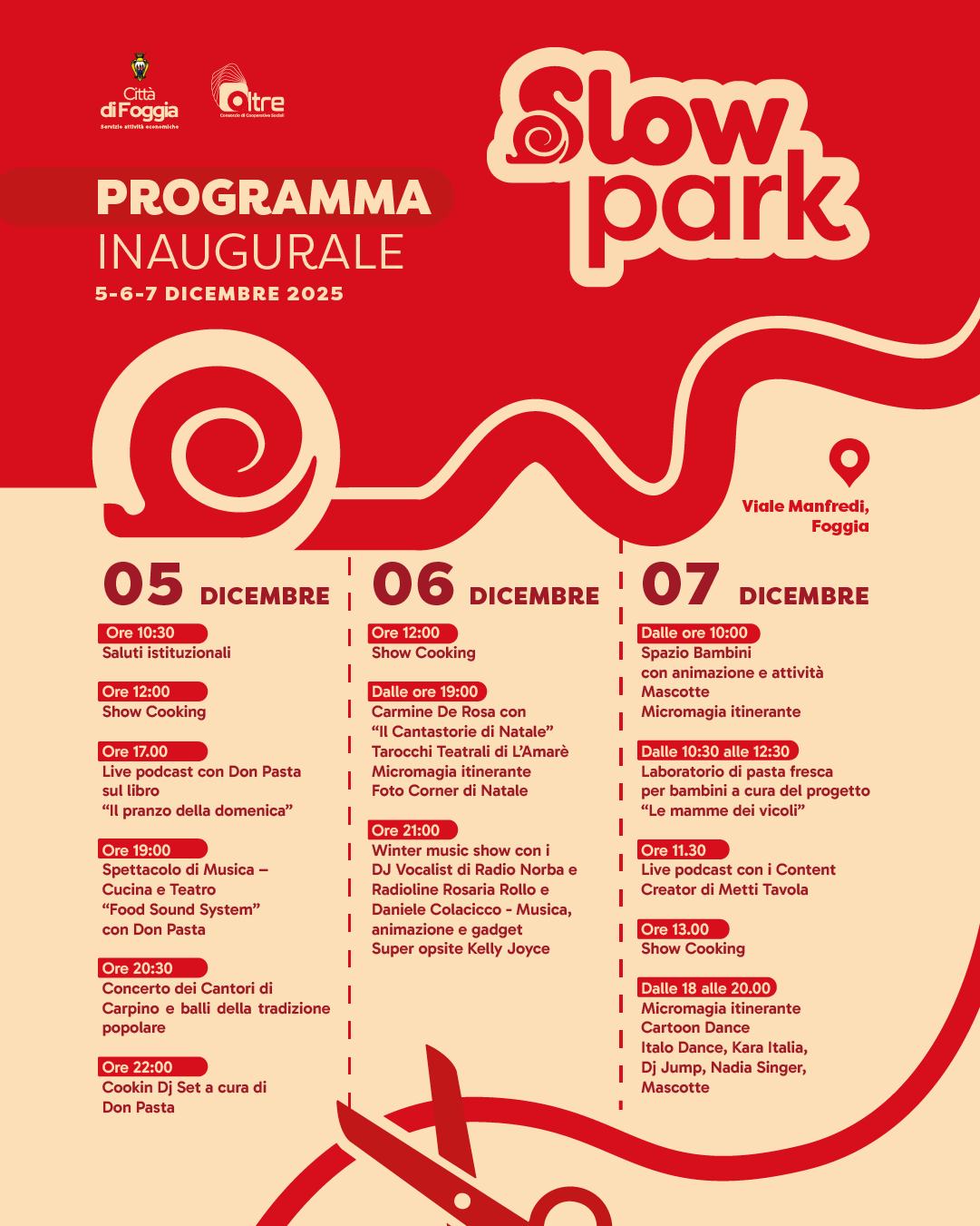 Venerdì 5 dicembre 2025 apre lo “Slow Park” di Foggia. Il taglio del nastro alla presenza delle autorità istituzionali si svolgerà a partire dalle ore 10.30 e darà inizio ad un lungo weekend di festa per celebrare l’avvio delle iniziative e salutare l’apertura del nuovo presidio di via Manfredi realizzato dal Comune di Foggia. A gestire la struttura sarà il consorzio di cooperative sociali Oltre la rete di imprese, che opera nel territorio della provincia di Foggia e non solo in un’ottica di responsabilità etica e solidale, aprendo il suo raggio di azione in settori quali accoglienza, inclusione, sviluppo locale, agricoltura sociale, antimafia, diritti, cultura, lavoro.